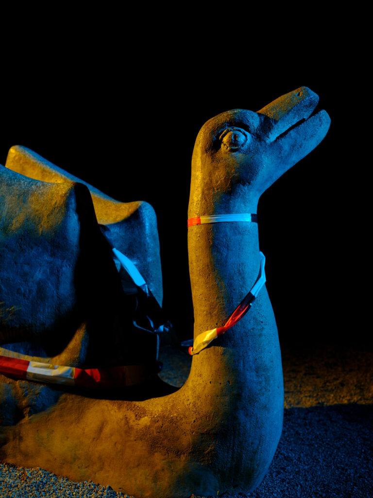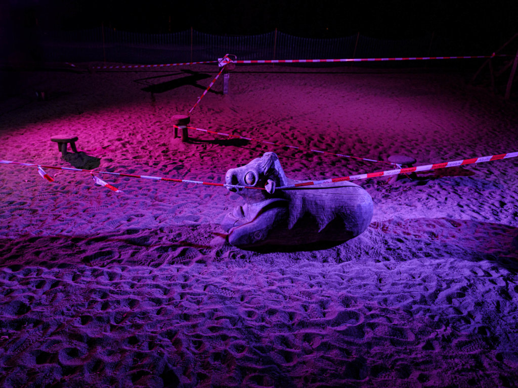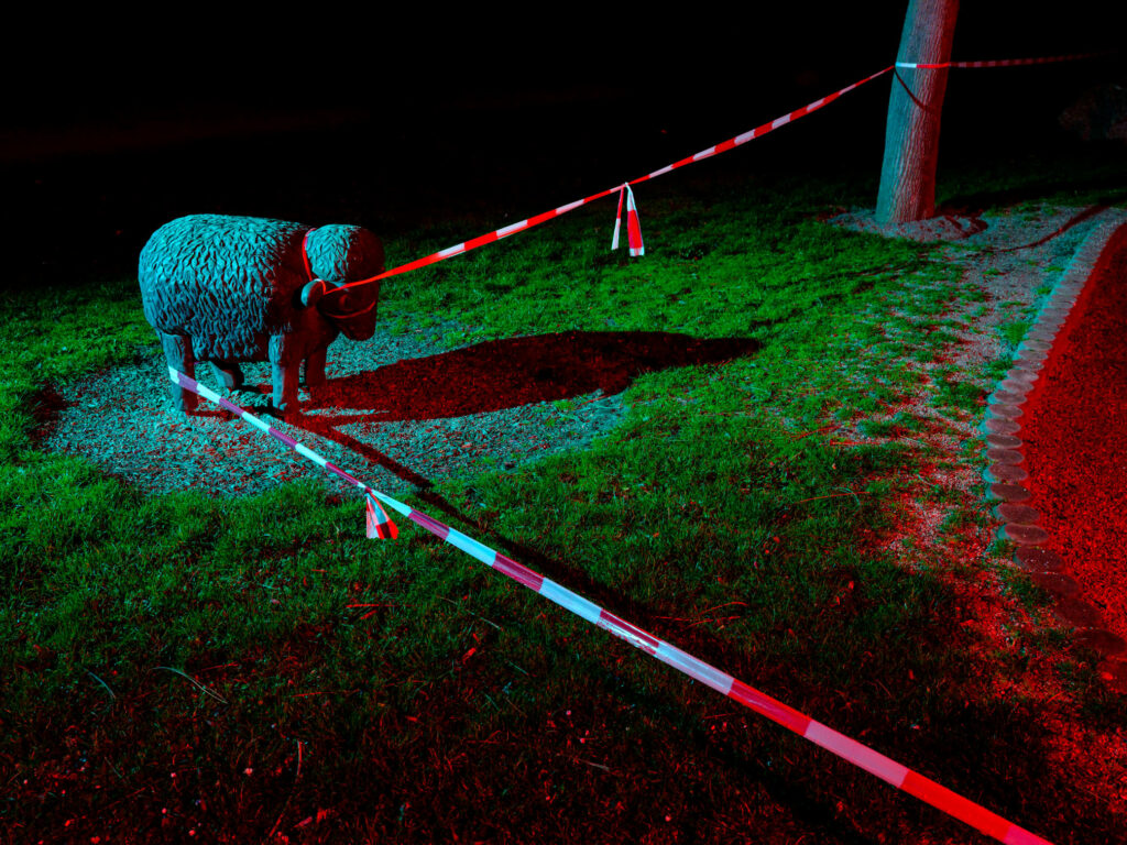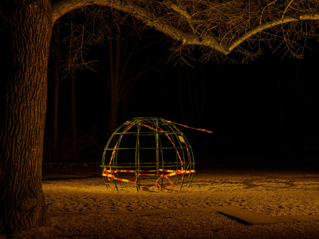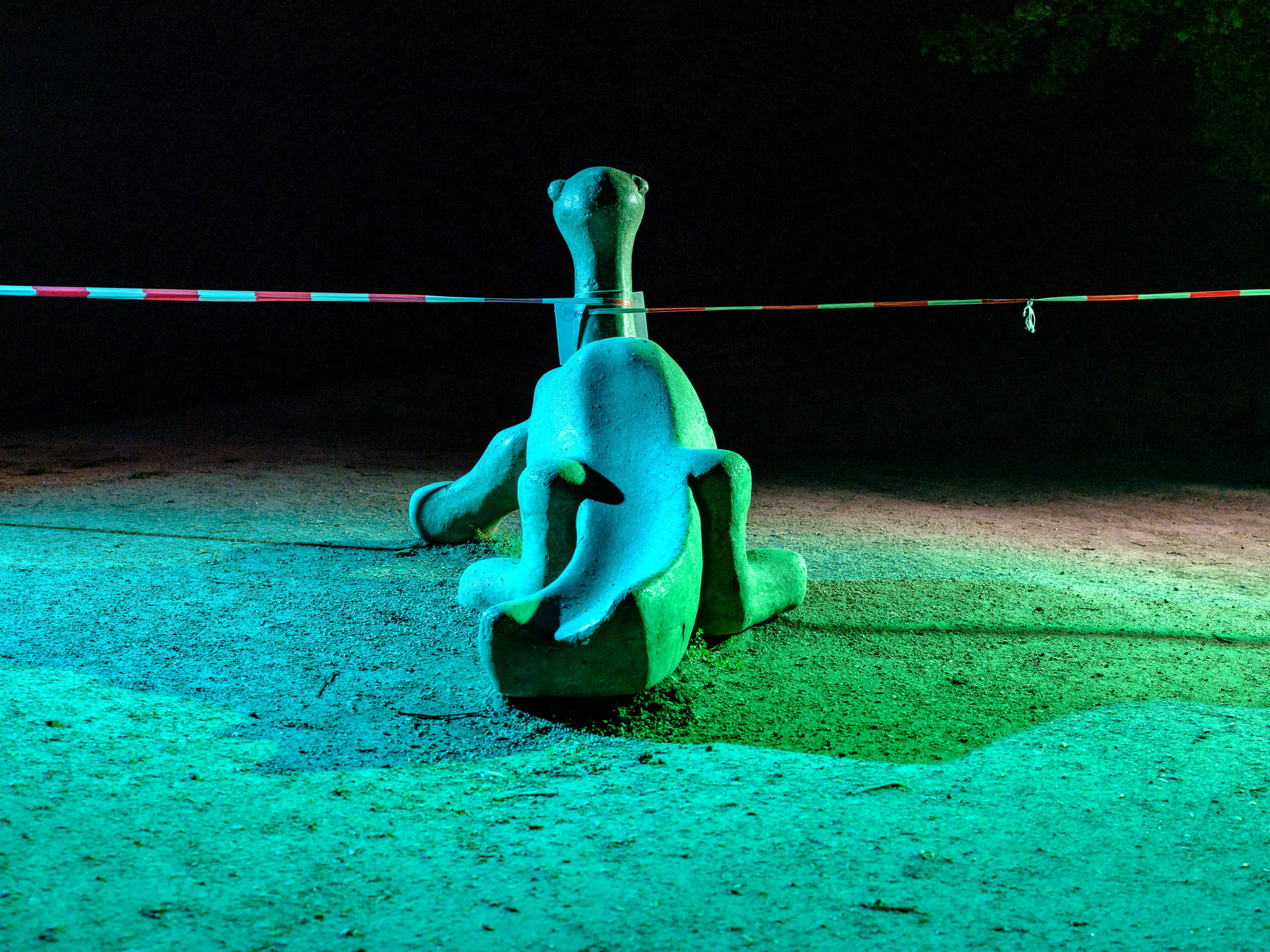 So wirken die eigentlich am Tage mit bunten Kindern belebten Tiere und Geräte wie leere Theater-Kulissen. Und das waren sie ja auch! Durch diese Serie zieht sich in jedem Fall eines: Der rot-weiße Absperrfaden!
