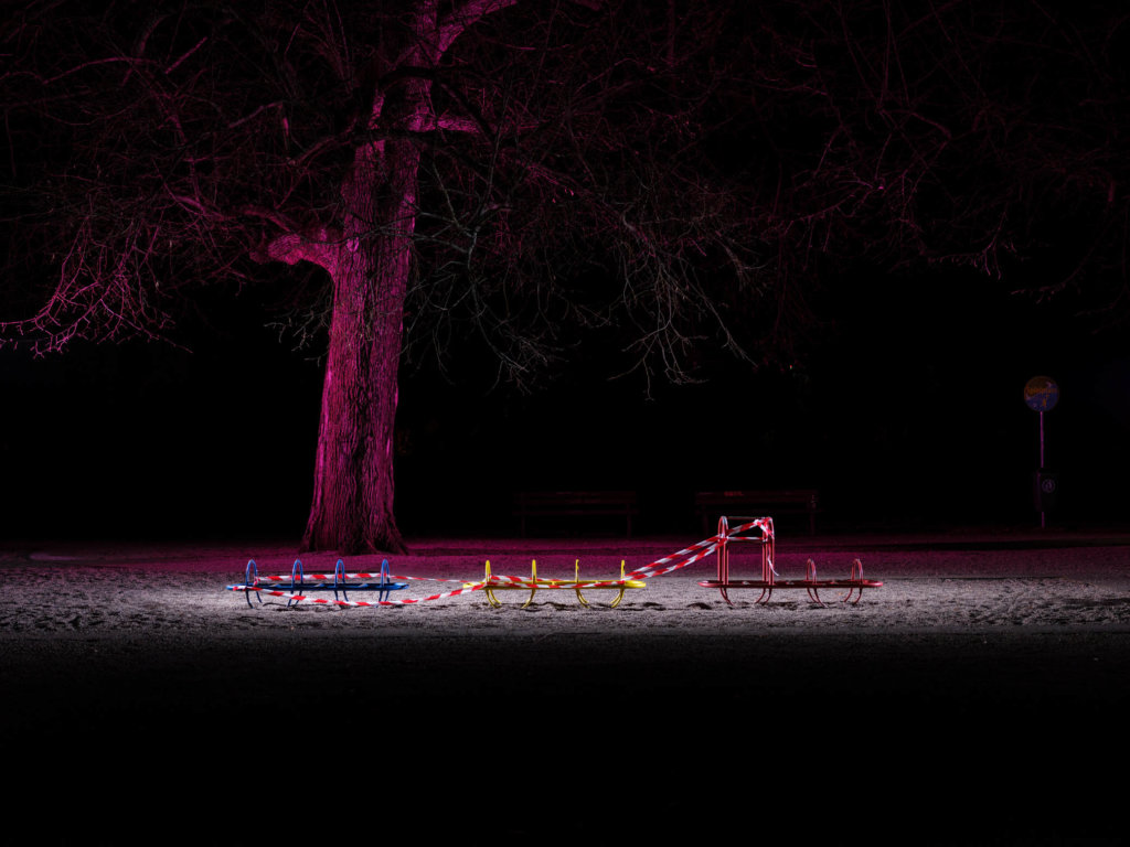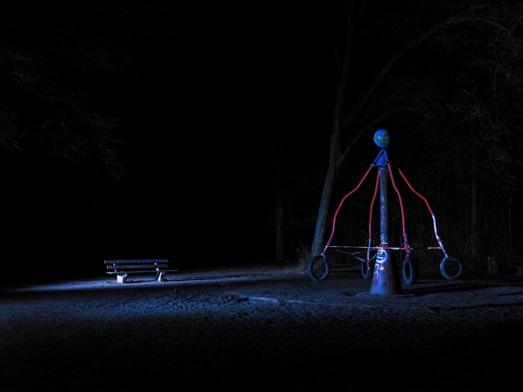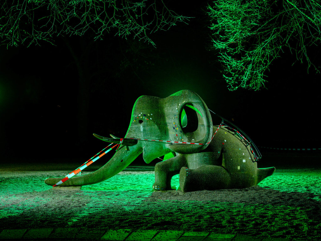 Im Frühjahr 2020 hat die Corona-Pandemie alles verändert. Sehr zeitig wurden landauf-landab die Spielplätze gesperrt. Das war auffällig. Und verlockte zu nächtlichen Inszenierungen mit farbigem Licht.